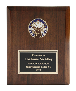 Reconize Any One Who Has Contributed Through Out The Year. A Color Filled Metal Emblem Featuring The B.P.O.E. Logo Rests upon A High Gloss American Walnut Board. Engraving Included. Please limit wording as the engraving area is 4" x 2.5"